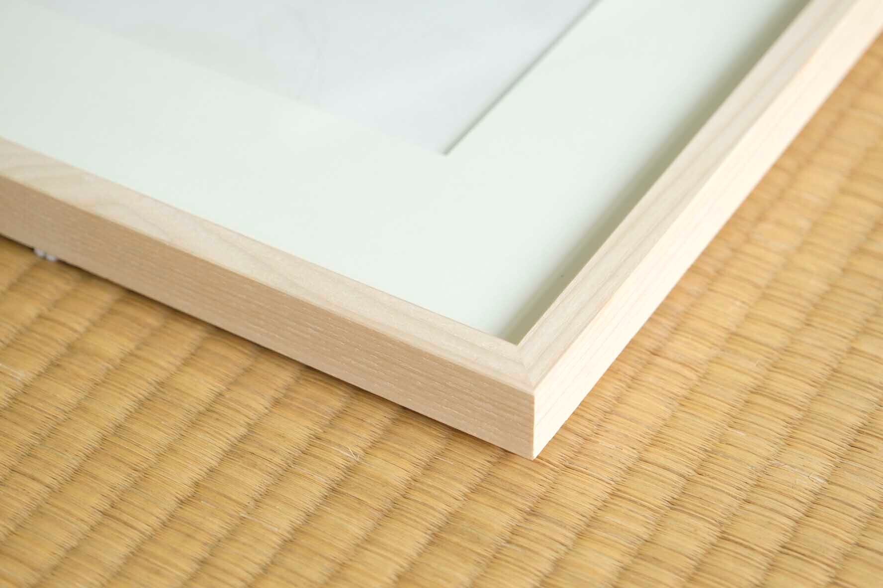 木製額(アッシュ材) FLAT14 無垢色 UVカットアクリル版、クリーム色のマット、裏板